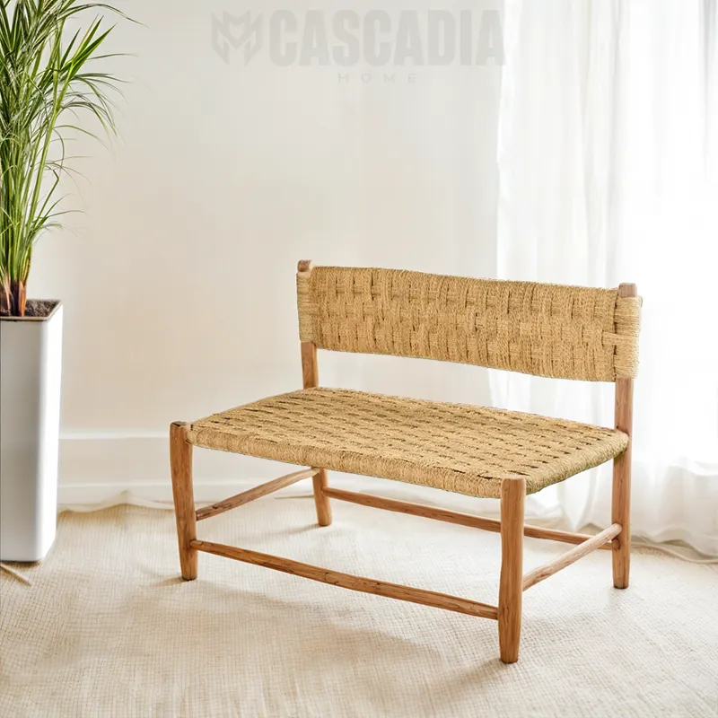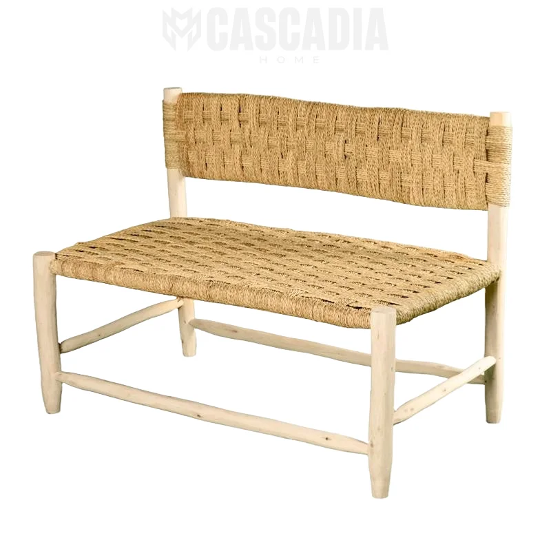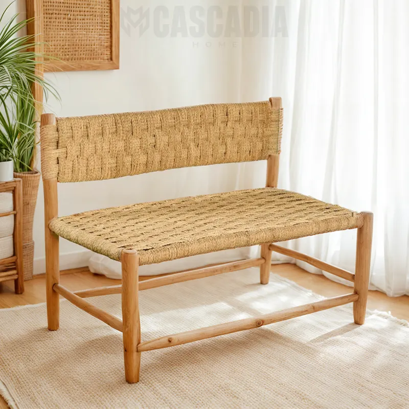 Banc en bois massif – Tressage artisanal en fibres de palmier