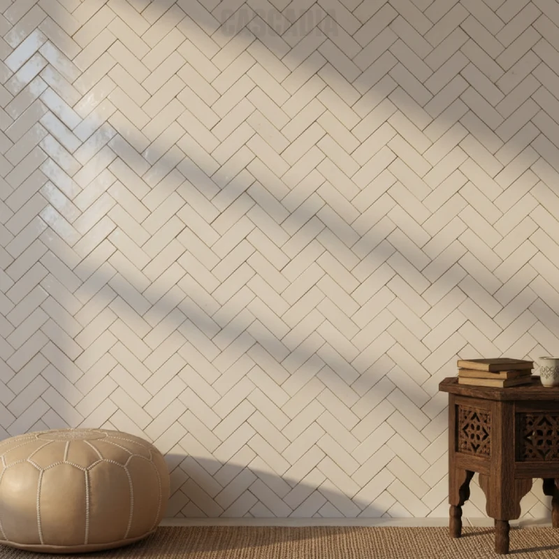 Le Bejmat Bianco présente de subtiles variations de teintes blanches, caractéristiques de sa fabrication 100 % artisanale. Ces nuances créent un rendu vivant et authentique, conférant caractère et originalité à chaque installation, qu’il s’agisse d’un intérieur moderne ou d’un projet traditionnel.