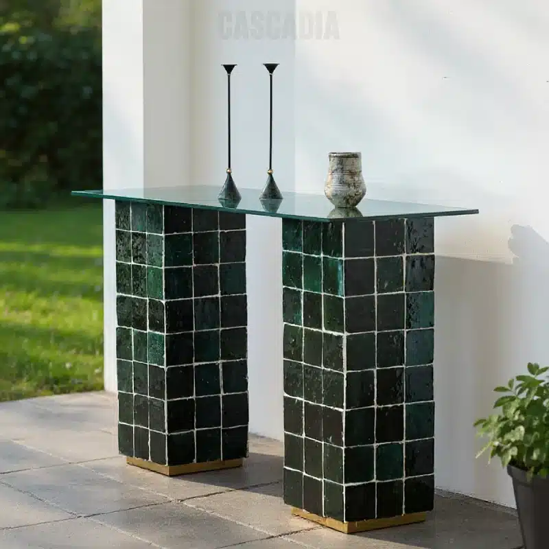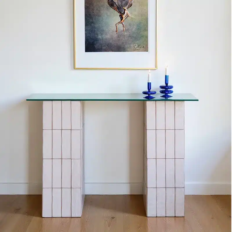Un chiffon doux et un peu d’eau savonneuse suffit pour entretenir votre console. Évitez les produits abrasifs pour préserver la beauté du zellige et la transparence du verre.