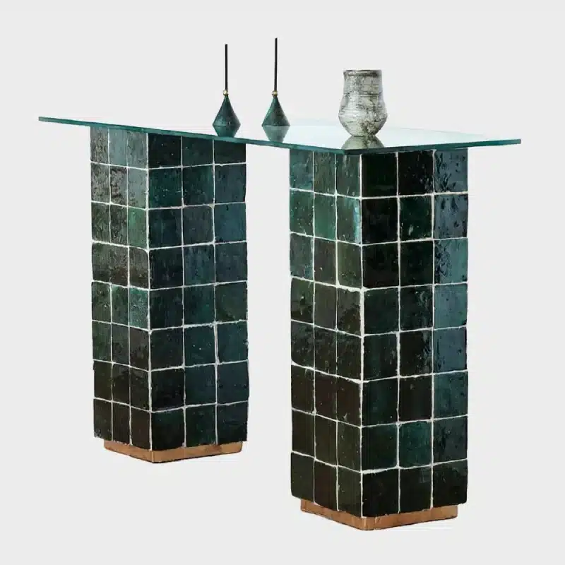 Chaque pièce est unique, réalisée avec soin par des artisans qualifiés. Les carreaux en zellige sont posés un à un sur deux colonnes solides, formant une base raffinée et graphique. La couleur du zellige est entièrement personnalisable pour s’harmoniser avec votre style.
