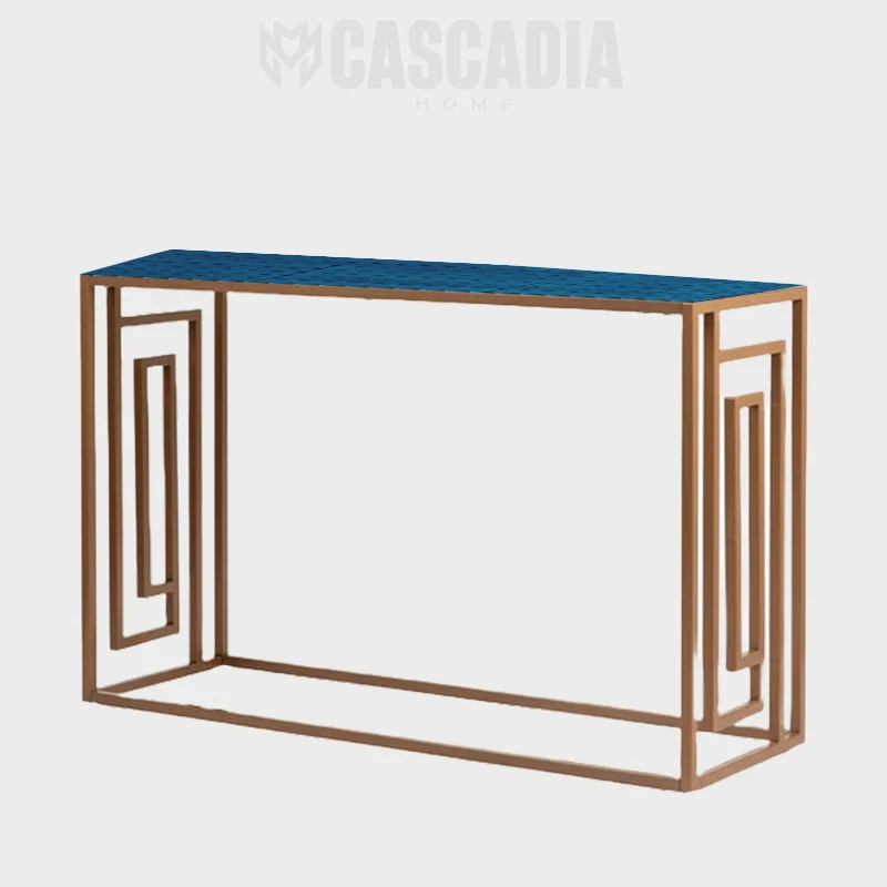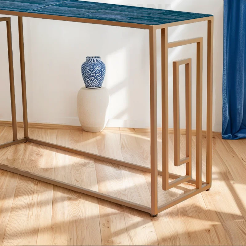 Console Olympia en zellige marocain et métal doré. Design moderne et élégant, finition résistante époxy. Idéale pour entrée, salon ou chambre. Meuble décoratif et fonctionnel, parfait pour une décoration marocaine contemporaine.