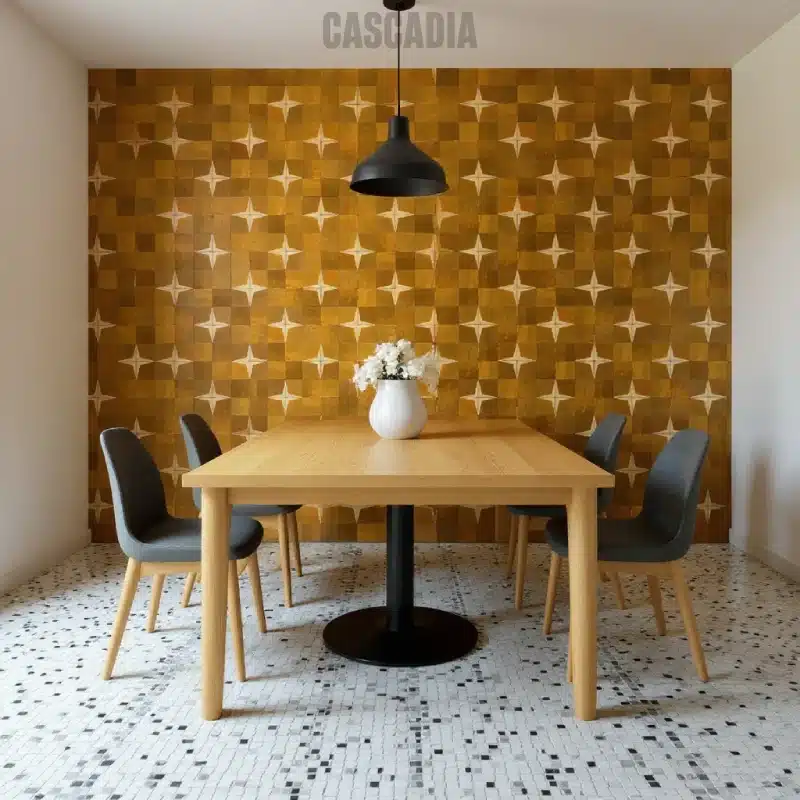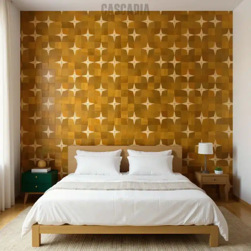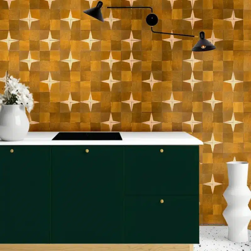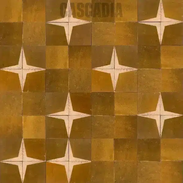 Zellige marocain Astra fait main. Motif d’étoiles à quatre branches sur damier créant un effet cosmique saisissant. Idéal pour murs et sols, en intérieur comme en extérieur.
