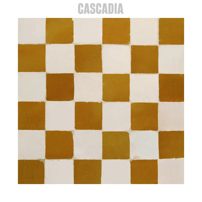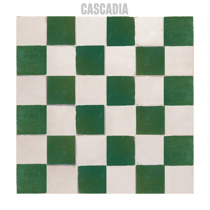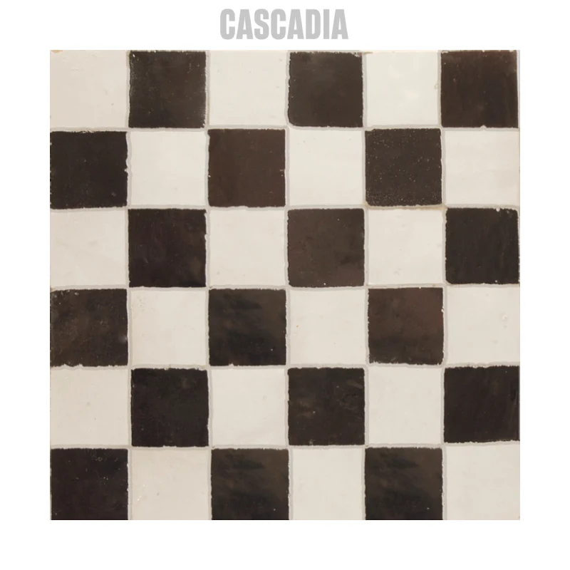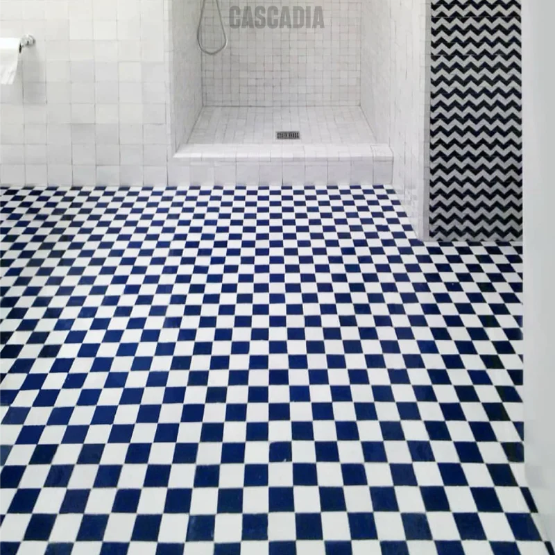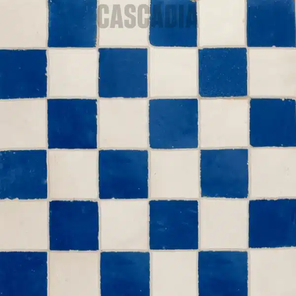Zellige marocain Chess fait main. Damier graphique aux carreaux carrés alternés créant un effet visuel saisissant et contemporain. Idéal pour murs et sols, en intérieur comme en extérieur.