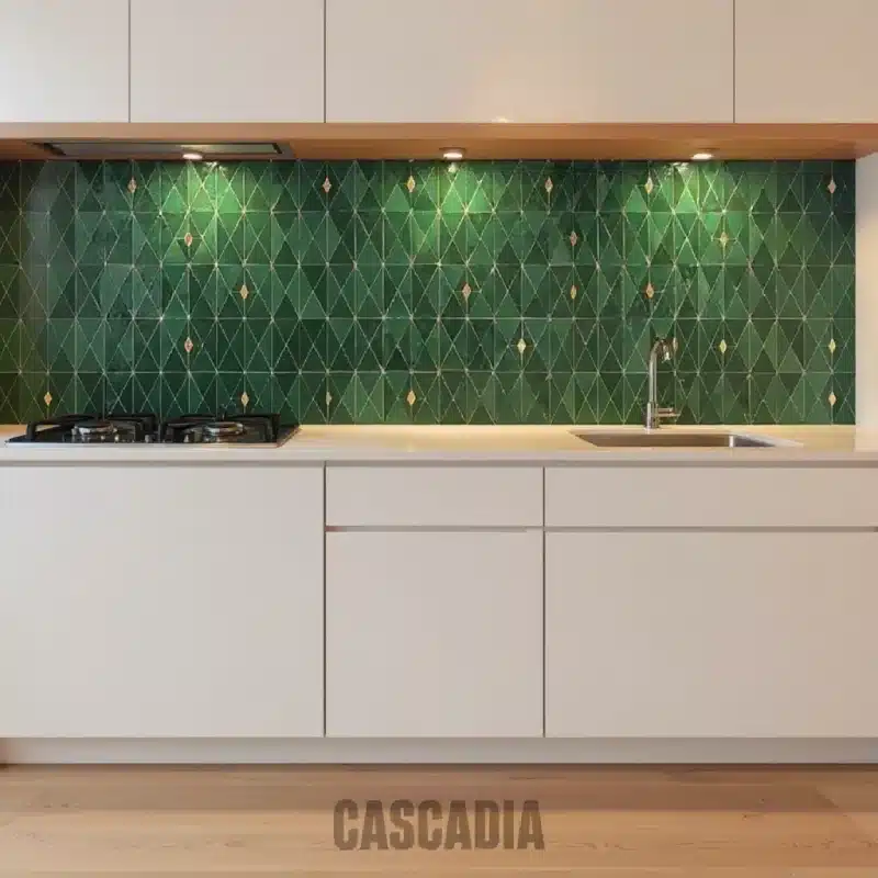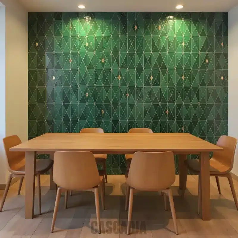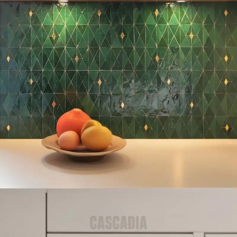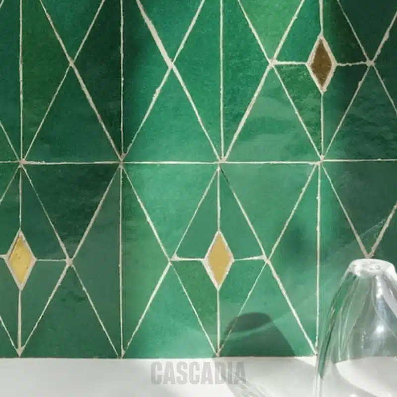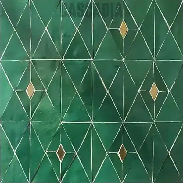Zellige marocain Hexago fait main. Mélange de formes triangulaires variées créant une composition géométrique riche. Idéal pour murs et sols, en intérieur comme en extérieur.
